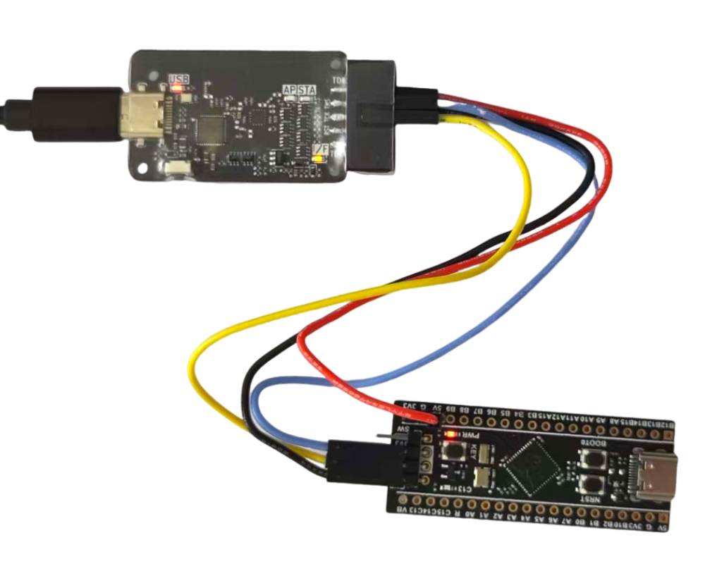 图中调试器一个为AP模式,不接目标板;另一个为STA模式,USB接电源、调试口接目标板